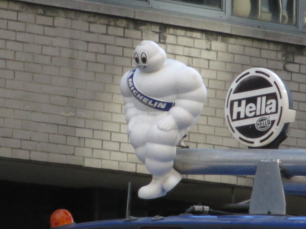 Maskotka Michelin Man zamontowana na ciężarówce w centrum Manhattanu, sfotografowana w 2014 roku