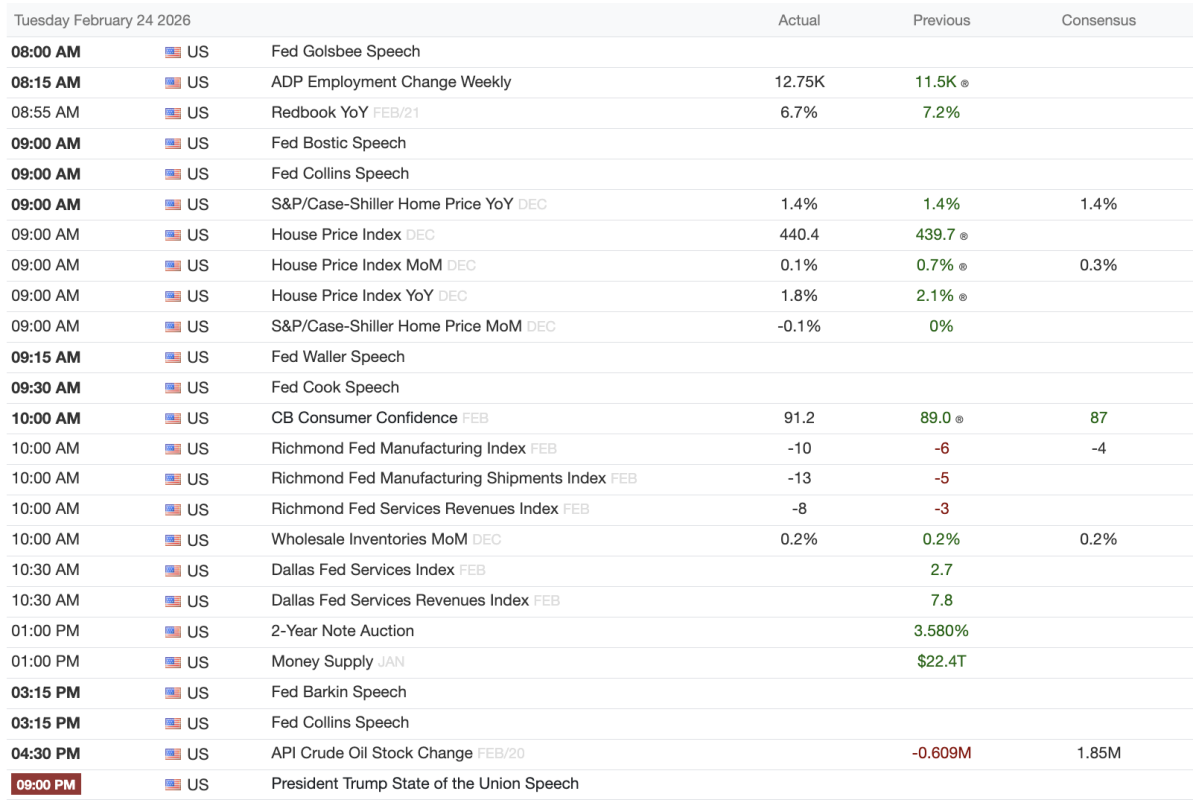 Prawdopodobnie zauważyłeś także ciemnoczerwoną ramkę wokół wydarzenia na dole. Oczekuje się, że dziś wieczorem prezydent Donald Trump wygłosi długie orędzie o stanie Unii. Może obejmować szeroki zakres tematów gospodarczych i rynkowych.
