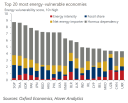 Wykres sporządzony przez Evghenię Sleptsovą z Oxford Economics przedstawia 20 największych krajów uszeregowanych według ich podatności na wstrząsy na światowych rynkach energii w oparciu o takie czynniki, jak efektywność wykorzystania energii przez ich gospodarkę, import ropy, uzależnienie od paliw kopalnych zamiast odnawialnych źródeł energii itp. Kryzys irański najbardziej dotknął kraje azjatyckie, a następnie mniejsze państwa europejskie.